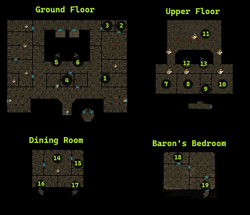 - Castias: the first time you enter, Castias will invite you to join him for dinner the next day (see Event - Speak with Castias)