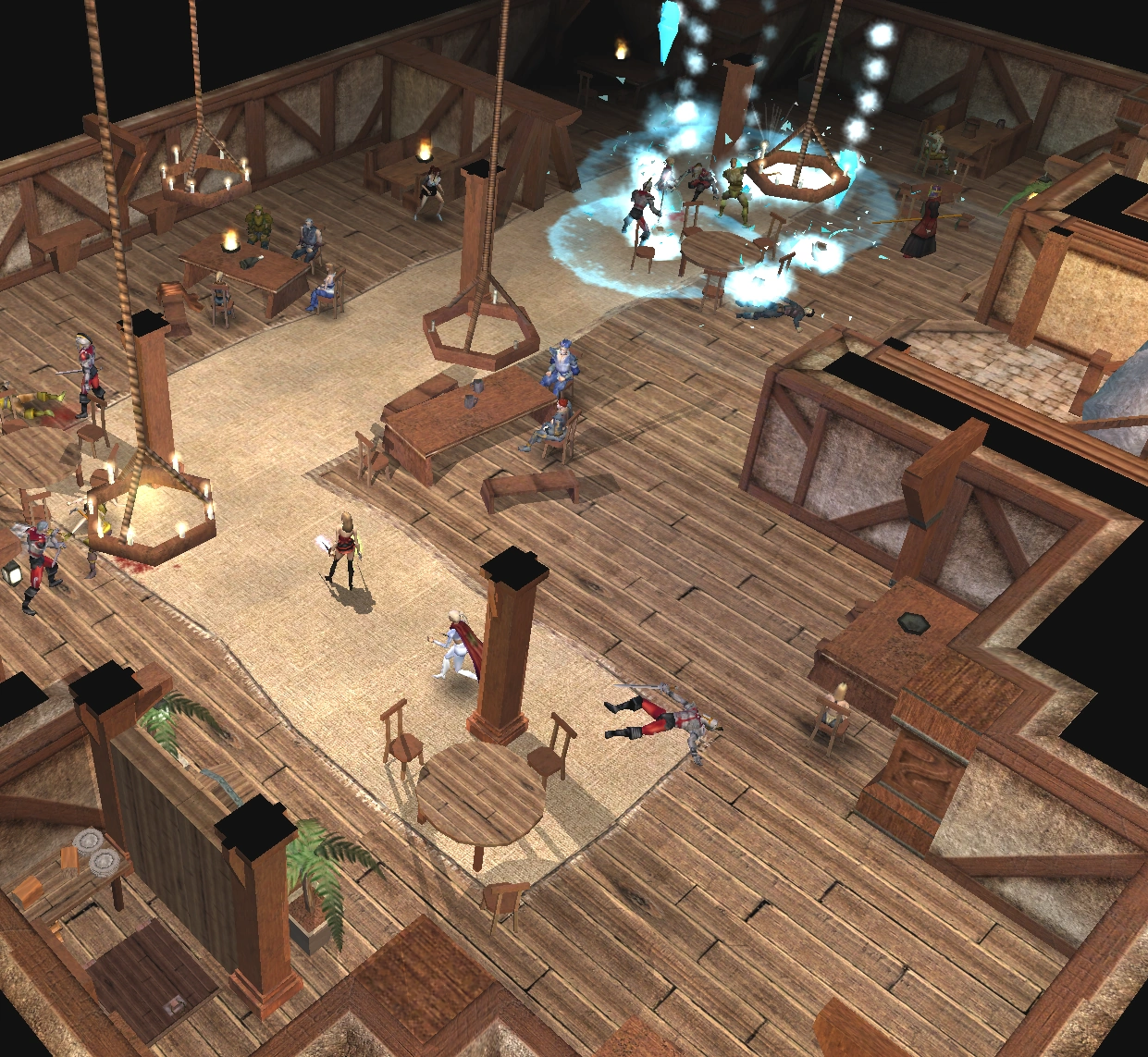 When you enter the Bear Pit, a waitress will greet you and seat your party. As the waitress takes your order, a large number of Dhorn soldiers will enter. Many will rush upstairs, while the remainder stay behind to secure the ground floor. After a few moments, sounds of battle can be heard from the upper levels and then the soldiers on the ground floor will attack. You can stay and fight or flee. If you decide to fight, the battle can be made easier by killing the battle mage first. Scrolls or potions of darkness can also help. See the Strategy Guide for more information.